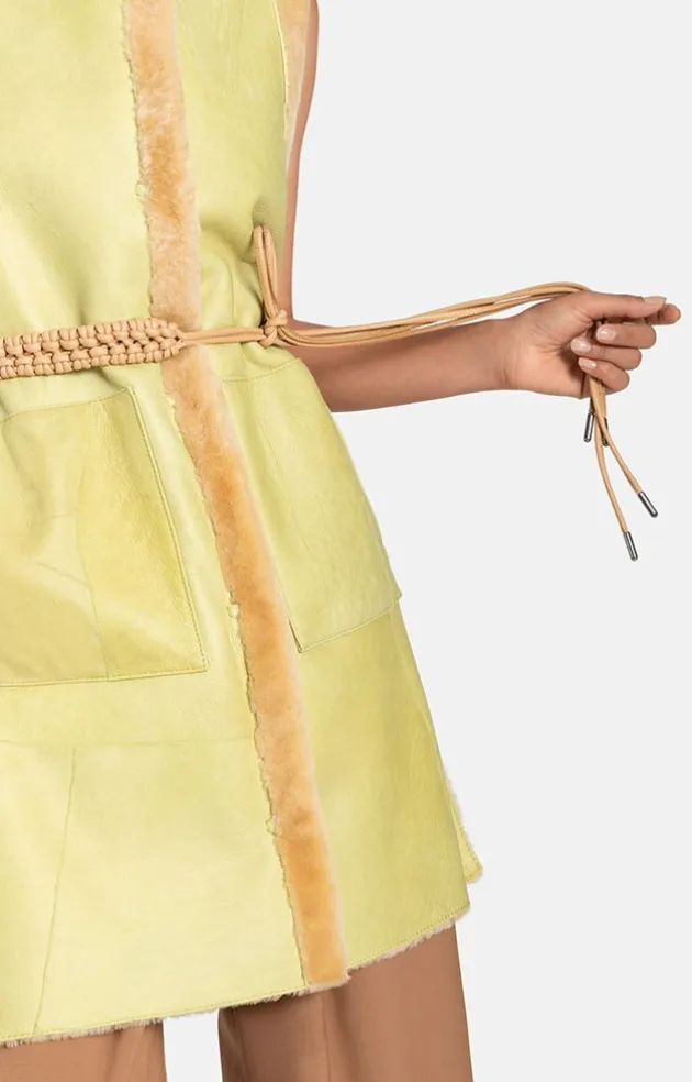 This Fur Waistcoat Made From High-Quality Lambskin Can Be Worn All Year Round. A Leather Belt In An Elaborate, Handmade Macramé Design Gives The Silhouette A Gentle Waistline And Allows The Jacket To Be Shaped And Adjusted As Desired To Perfectly Accentuate The Figure. The Leather Inside With Deliberately Irregular Stitching Features Soft, Smooth Seams. Always The Perfect Companion On Chilly Summer Evenings Or Indoors Over A Jumper In Winter.