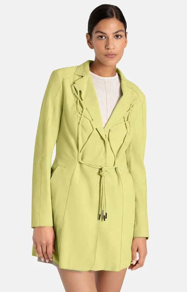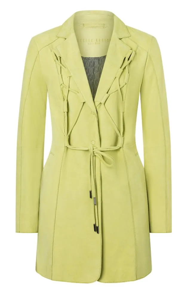 This Open-Edged Short Coat Impresses With Its Feminine Silhouette And Unique Craftsmanship. The Handmade Leather Straps Are Pulled Through Loops, Giving The Jacket A Subtle But Flattering Waist. Further Details, Such As The Side Slit Pockets, Hand Sewn Press Studs And A Back Slit Round Off This Key-Piece.
