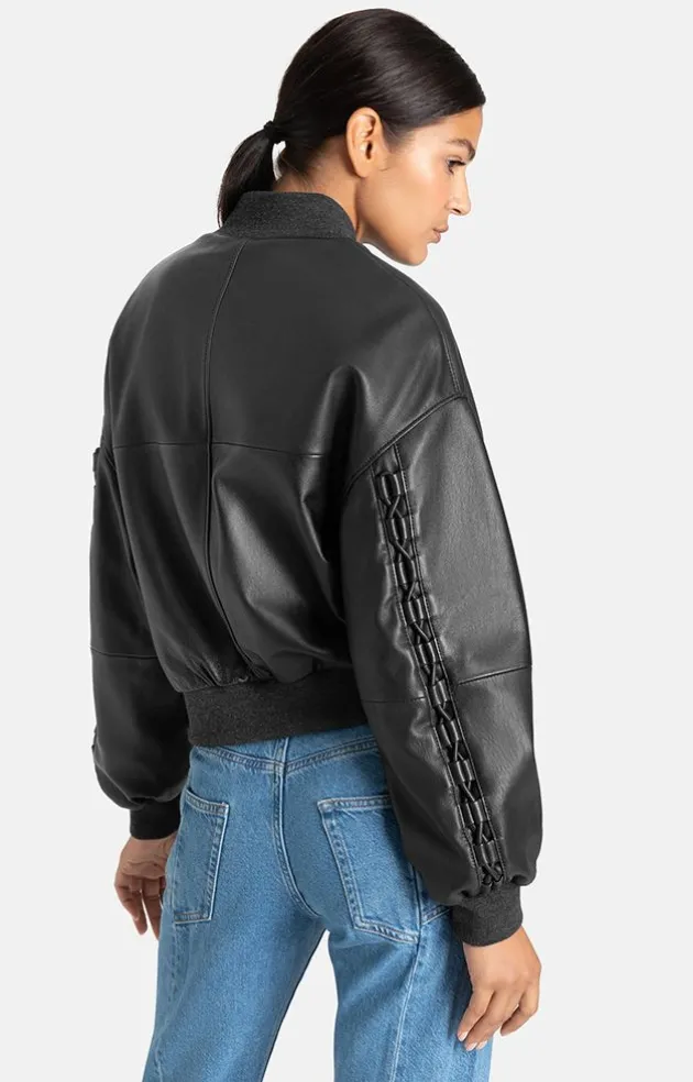 This Jacket Features Unique Craftsmanship. The Handmade Leather Straps Are Pulled Through Loops That Are Attached Along The Longitudinal Seams On The Front And Sleeves. This Gives The Short College Blouson Made From Soft Lambskin Nappa With A Slightly Dropped Shoulder An Upgrade. The Small Stand-Up Collar, Waistband And Sleeve Cuffs Are Made From Fine, Mottled Knit Matching In Colour. It Fastens With A Sporty Metal Zip. The Vertical, Extra Comfortable Pockets Can Also Be Closed With Metal Zips. A Blouson With Festival Attitude.