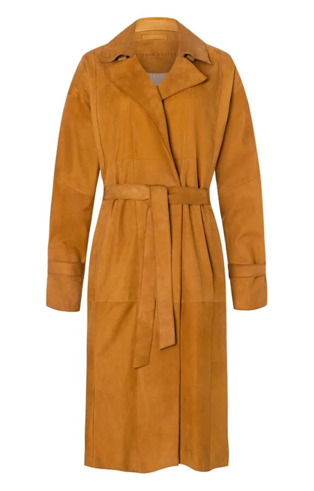 This Generously Cut Coat Made From The Finest Goat Suede Features Many Striking Details.The Front Edge With Concealed Metal Press Studs Is Slightly Moved To One Side And, When Worn Open, Flows Into A Lapel Collar That Can Also Be Fastened High With Small Latches. High Side Slits And A Waist-High Back Vent Offer Plenty Of Freedom Of Movement And Create A Sophisticated Look. The Back Slit And The Upper Back Section Are Partially Lined. The Width Of The Coat Can Be Adjusted With A Tie Belt. A Slightly Narrower Version Of The Tie Belt Is Also Fitted To The Sleeves. A Strong Coat Made Of Superfine, Ultra-Lightweight Goat Suede.