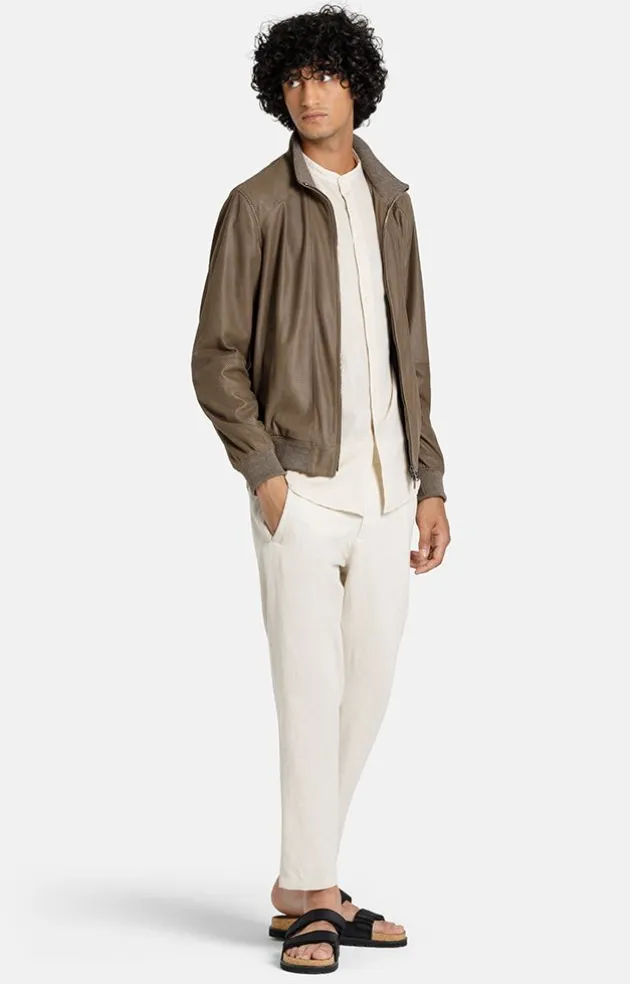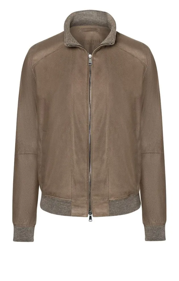 This Unlined Blouson In A Classic Shape Impresses With Its Very Soft, Perforated Goatskin Suede. It Is Closed Up To The Small Stand-Up Collar Using A Two-Way Metal Zip. It Has A Fine, Slightly Mottled Knit On The Waistband, Sleeves And Inside Collar. Despite Its Unlined Finish, This Summery Blouson Has Two Functional Inside Pockets That Close With Fine Zips.