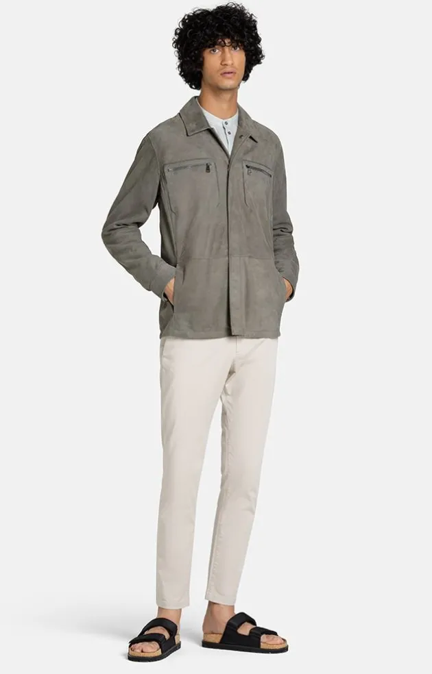 Very Casual Style In Lightweight, Unlined Goatskin Suede. The Front Edge With Concealed Press Studs And The Side Pockets Integrated Into The Seam Are Totally Discreet, Making The Breast Pockets All The More Impressive. They Are Skilfully Incorporated Into The Front And Are Closed Using Metal Zips. The Shirt-Style Cuffs Can Be Opened To Roll Up The Sleeves Comfortably. Although It Is Unlined, It Still Has Two Practical Inside Pockets.