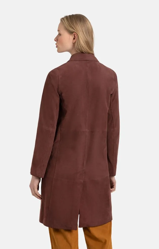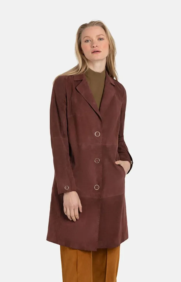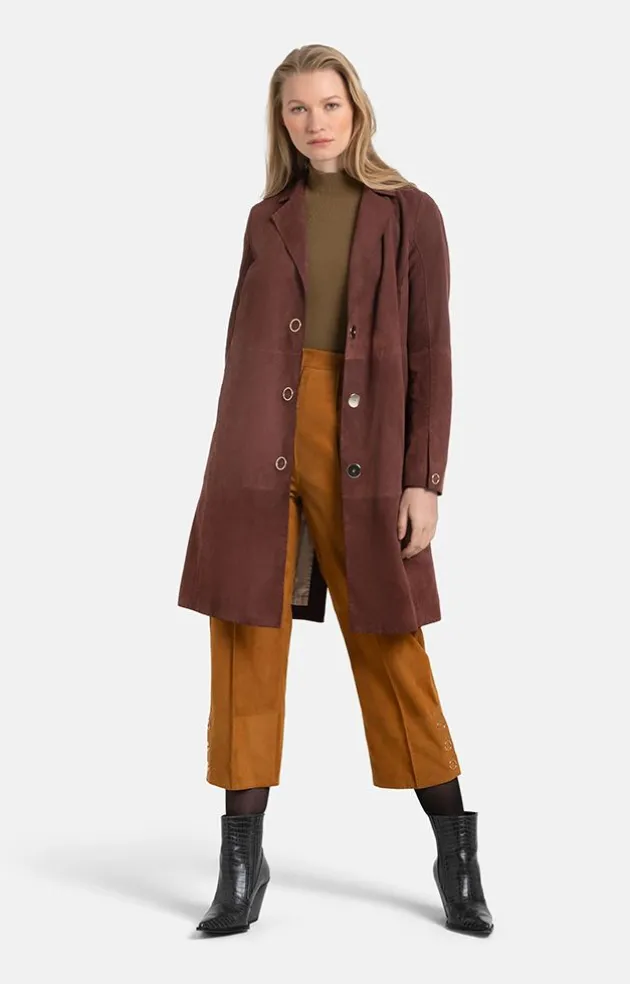 You Will Be Thrilled With This Coat Crafted In The Finest, Velvety Goatskin Suede. Cut Edges And Tastefully Hand-Stitched Seams Create Lightness And A Distinctive Line. The Lapel Collar And The Knee-Length Straight Cut Lengthen The Silhouette. The High Back Vent, Which Can Be Closed With A Small Press Stud, Ensures Freedom Of Movement For The Legs. Adding A Really Nice Touch Are The Ring-Shaped Metal Studs. The Cuff Slits Are Also Fastened With Such High-Quality, Ring Press Studs. Wearing The Coat Open Creates A Very Light, Summery, Carefree Note. Another Distinctive Feature Is The Luxurious Lining Inside Made From A Silk Blend And With A Logo Pattern Woven In.